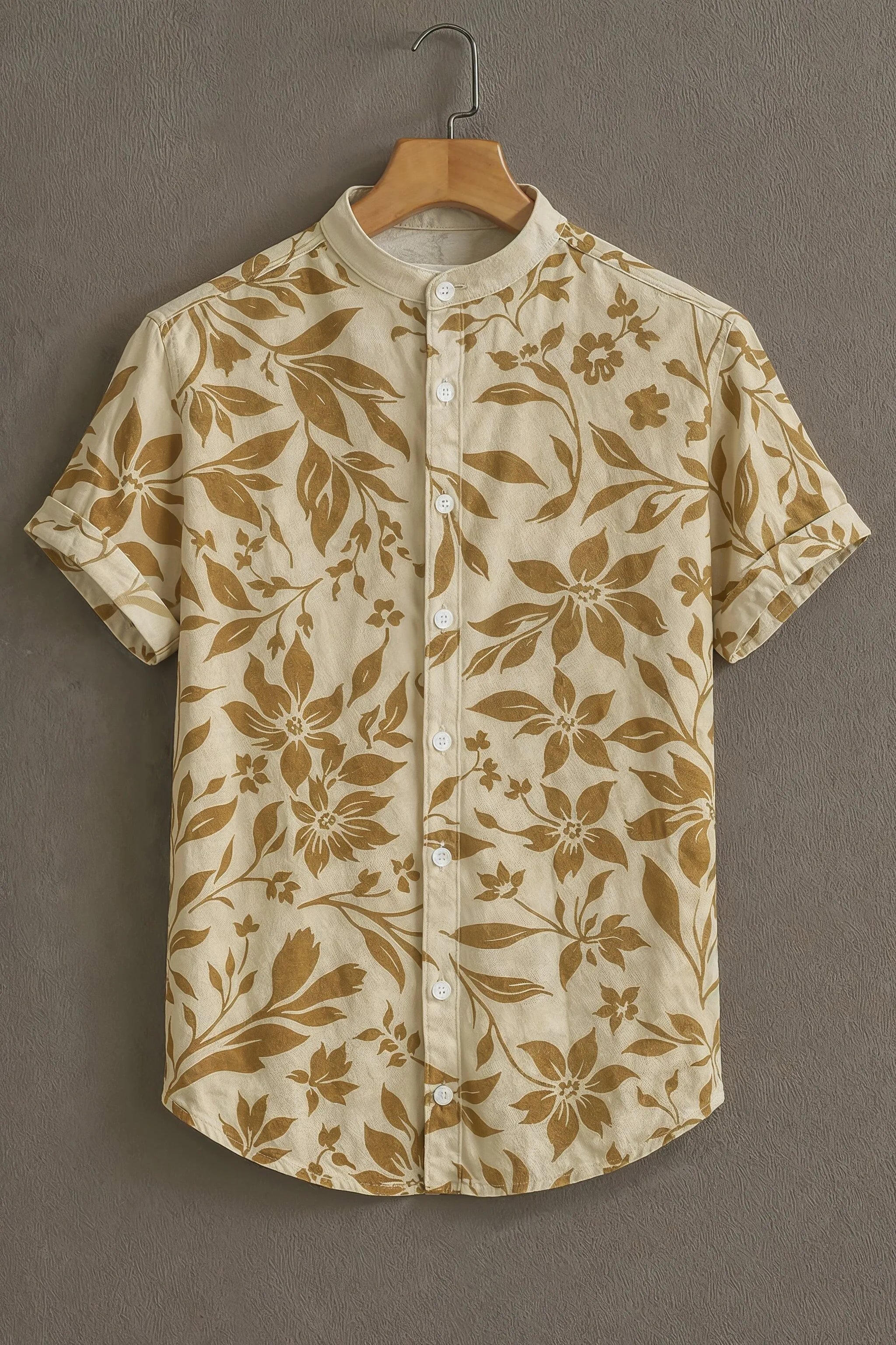 Cream Flower Pattern Casual Mens Half Sleeves Shirt